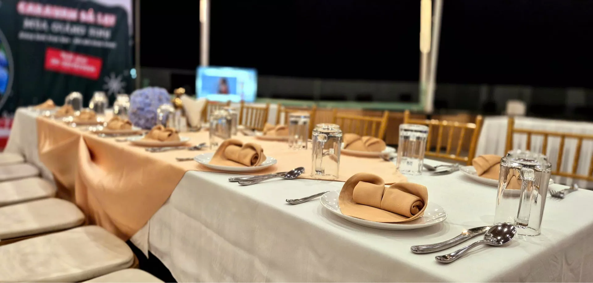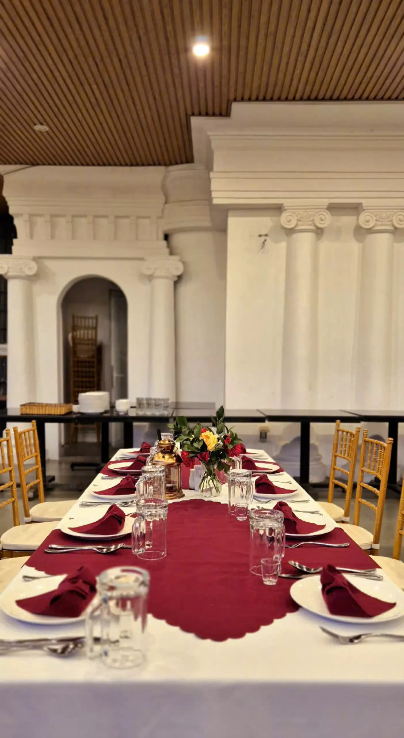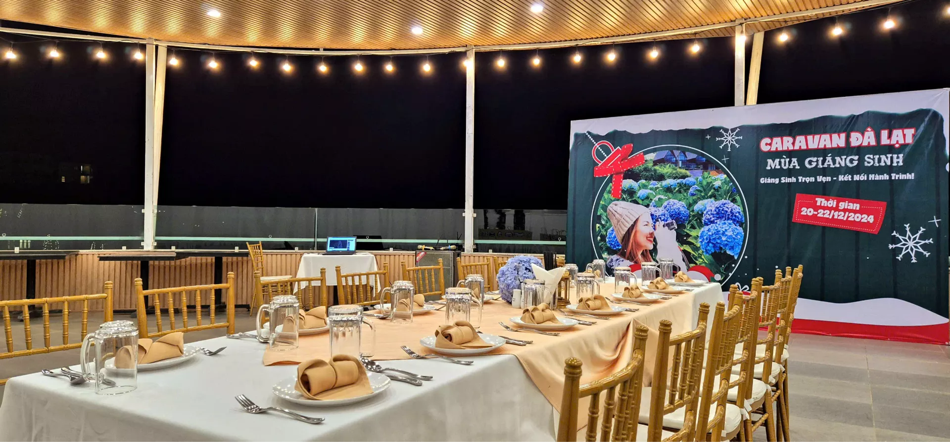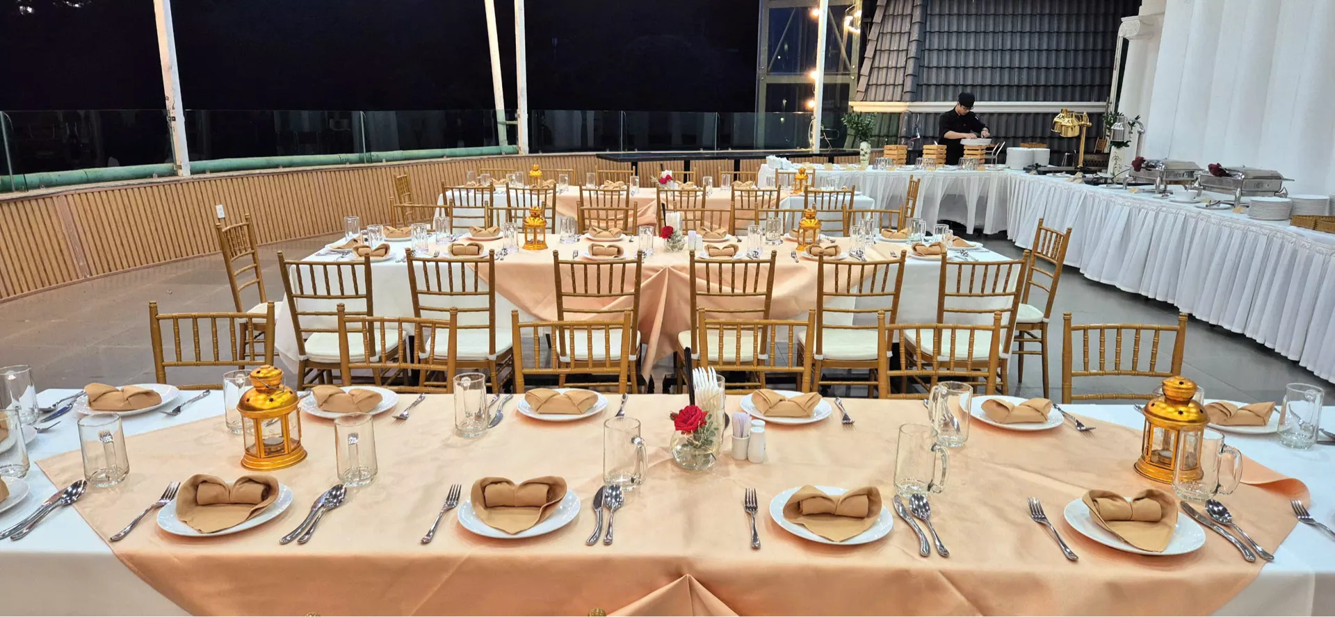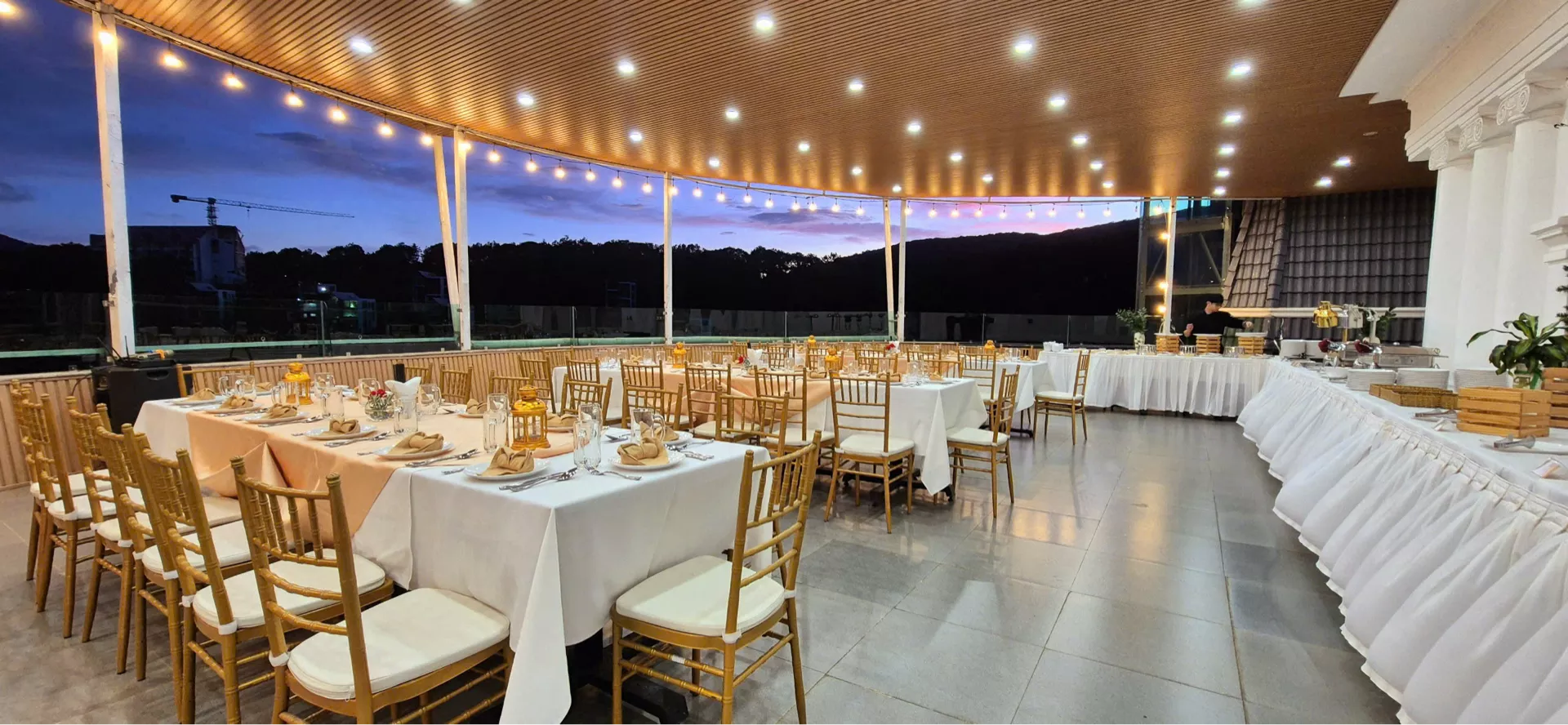 Không gian Terrace đặc biệt phù hợp cho các buổi private gathering, tiệc cưới quy mô nhỏ, hoặc các sự kiện cần sự tinh tế nhưng không quá hình thức. Khi ngày dần trôi về chiều, ánh hoàng hôn phủ nhẹ lên không gian, kết hợp cùng ánh đèn ấm áp khi đêm xuống, tạo nên bầu không khí lãng mạn và đầy cảm xúc cho mỗi buổi tiệc.