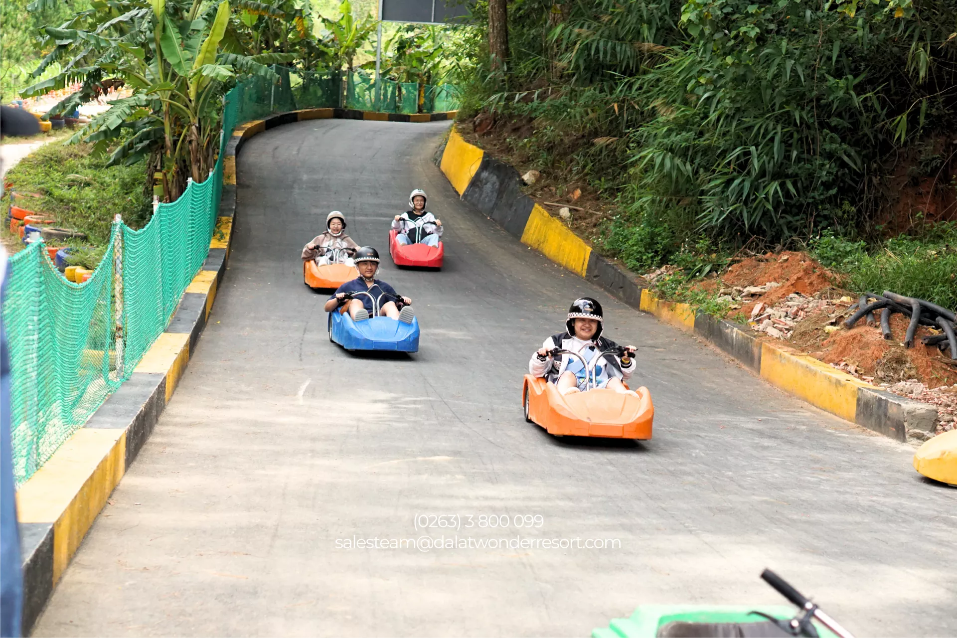 달랏 원더랜드의 썰매 타기는 편안하면서도 신나는 즐거움을 선사합니다. 방문객들은 썰매에 올라타 구불구불한 경사면을 따라 미끄러지듯 내려가며 부드러운 곡선을 따라 이동하고, 편안한 기분을 만끽하며 주변의 울창한 녹음을 감상할 수 있습니다.