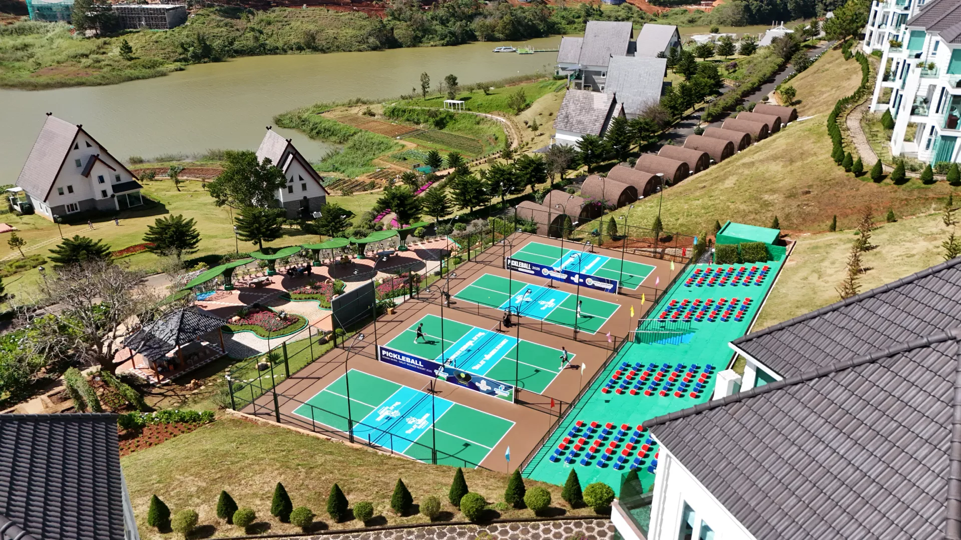 Không gian sân Pickleball của chúng tôi được thiết kế mở, nằm bên bờ hồ trong vắt, bao quanh bởi thảm cỏ xanh và làn gió mát đặc trưng của cao nguyên. Đây không chỉ là nơi để rèn luyện sức khỏe mà còn là điểm hẹn lý tưởng để kết nối, giao lưu và tận hưởng niềm vui thể thao cùng bạn bè hoặc người thân.